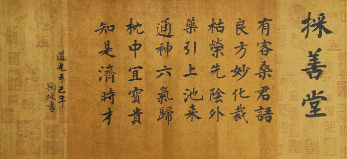 道光年間,巫宜福回鄉(xiāng)省親,盧宏漢上門(mén)拜訪,并贈(zèng)送“萬(wàn)應(yīng)茶餅”及述詳“萬(wàn)應(yīng)茶餅”功效。巫宜福返京時(shí)將“萬(wàn)應(yīng)茶餅”帶回京城,此時(shí)京城正鬧瘟疫,百姓深受瘟疫之苦,巫宜福得知情況后叫人把家鄉(xiāng)帶來(lái)的“萬(wàn)應(yīng)茶餅”煮好給百姓服用,服用過(guò)“萬(wàn)應(yīng)茶餅”的百姓病情大為好轉(zhuǎn),幾日便身體康復(fù)。為此,巫宜福親筆寫(xiě)下“采善堂”三個(gè)大字,并題附上五言詩(shī)一首,曰: